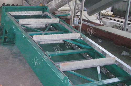 WBF转刷网蓖式格栅除污机主要由驱动装置、机架、主轴、栅网、托渣板、固定板刷、回转刷及牵引链组成。在电机驱动下,通过减速机减速后,带动链轮与链条运动,固定在回转链条上板刷沿栅网网面由下而上移动,清扫网面并带走污物,污物运送至顶部时,大部分靠重力自行落至排渣都,少量附着在固定板刷上的污物被转动的回转刷清除掉,完成除污过程,液体则通过栅网的间隙流过,整个工作过程连续进行。